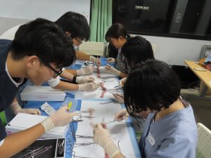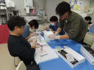 2年性から6年性までの医学生約15名がご参加され、皆が真剣に手技に取り組んでいました。腸管吻合はインストラクターとマンツーマンで行い、縫合や結紮を存分に行いました。運針の場面では教えた直後からスムーズに手が動いており、その上達の早さに驚かされました。糸結びの場面では、様々な結び方に挑戦し、自主的に何度も繰り返して練習し習得しようとする姿勢が非常に印象的した。