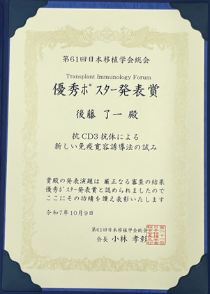 後藤 了一 講師の「抗CD3抗体による新しい免疫寛容誘導法の試み」が優秀ポスター発表賞に選ばれました。